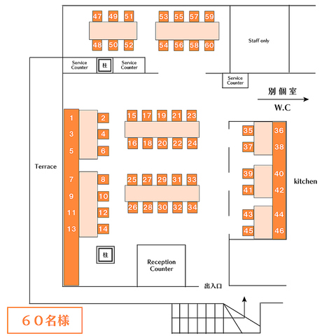 | テーブル | 60名様×1 | 【ホール席+個室】 60名様 |