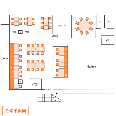 | テーブル | 65名様×1 | 【基本の全体平面図】確定人数にあわせて、様々なレイアウトになります。詳しくはスタッフへお尋ねください。 |