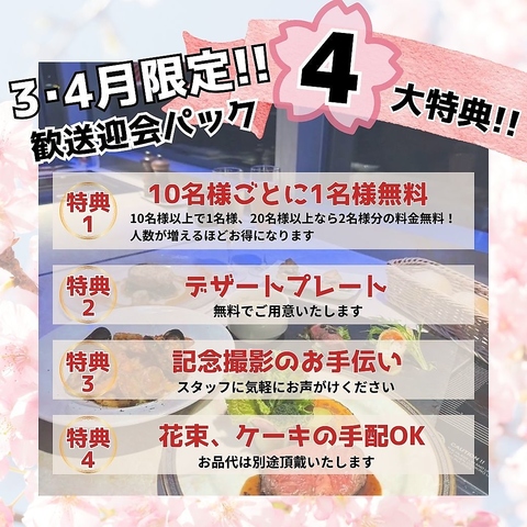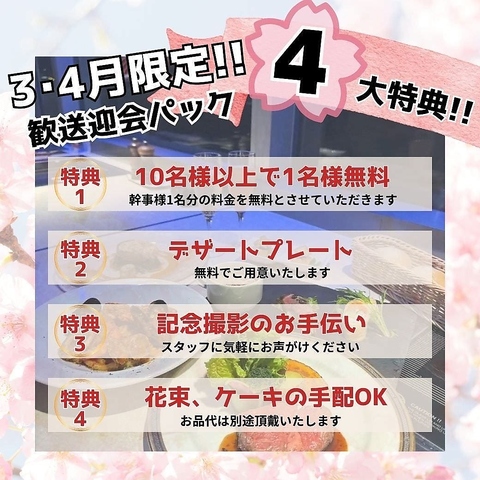 歓送迎会に最適な4大特典パックをご用意。ご予約時にお電話かネット予約備考欄にてご連絡ください。