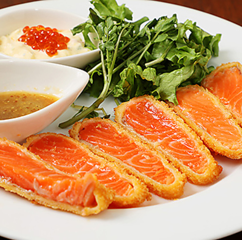 サーモンキムチ・サラダ・味噌汁付き ご飯大盛+100円青森ブランドサーモンの海峡サーモンを外はサクッと中はプリっと生レアカツレツに、タルタルソースと特製ソースでご賞味あれ!※ご予約限定メニューです。前日までにご予約お願い致します。