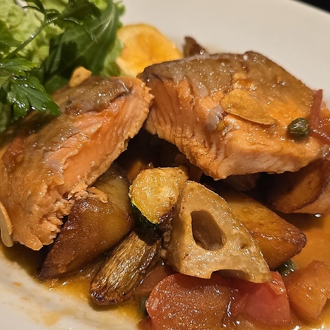 サラダ・味噌汁付き ご飯大盛+100円青森ブランドサーモンの海峡サーモンを贅沢に150gミディアムレアステーキに、旬のゴロゴロお野菜と特製のレモンバター醤油のソースと自家製タルタルソースでご賞味あれ!※ご予約限定メニューです。前日までにご予約お願い致します。
