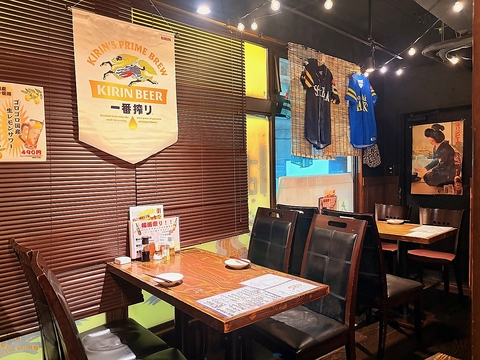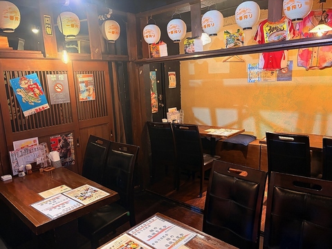 | テーブル | 4名様×7 | 昭和を感じさせるレトロな装飾が施された店内は、どこか懐かしさを感じさせてくれます♪こだわり抜いた九州料理とおいしい飲み物で、盛り上がること間違いなし! |