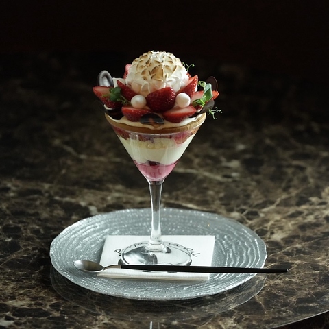 【構成】イタリアンメレンゲ/プラリネジェラート/苺/メレンゲ/チョコレート/レモンカード/シャンティ/フランボワーズソルベ/クッキー/グロゼイユ/薔薇ジュレ/ジェノワーズ/ミルクジェラート/クレームダンジュ/アーモンドガレット/アーモンドミルクパンナコッタ/求肥/グリオットのマセレ/木苺とビーツのクリーム