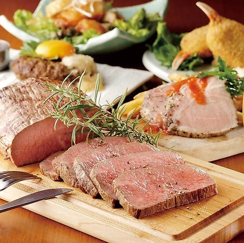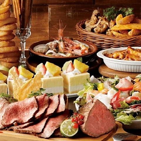 専門シェフが手掛ける名物料理が勢揃い!低温調理でしっとり柔らかな「黒毛和牛ローストビーフ」は必食です。さらに生地から手作りの「自家製ピッツァ」、季節の「アヒージョ」、スペイン風「パエリア」など、豊富な絶品メニューをご堪能いただけます。