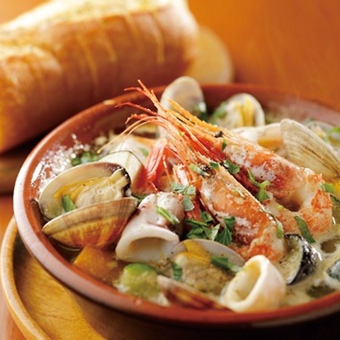 海老、アサリ、ムール貝などの海の幸をガーリックオイルで煮込んだ、旨みの詰まった一品。