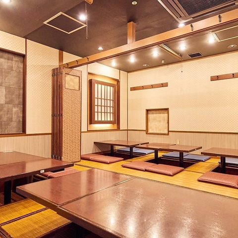 【ゆったり寛げる個室】長時間の宴会でも脚を伸ばしながら寛げる掘りごたつございます。快適な空間で大人数の飲み会にもしっかり対応◎宴会向けの飲み放題付きコース料理や、幹事様にも嬉しいクーポンも多数ご用意しております!仕事終わりにも気軽にお立ち寄りください。