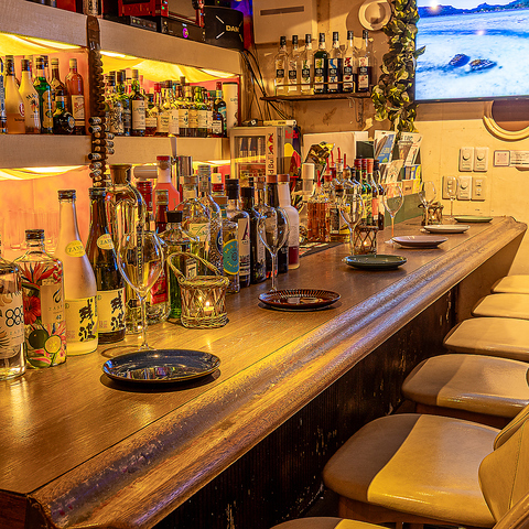 【南国風の店内】扉を開ければ、ウッドチャイムの音色とココナッツの香りが包みます☆大型プロジェクター完備でスポーツ観戦にもぴったり!グループ利用にぴったりのソファー席やお一人様も歓迎のカウンター席など、シーンに合わせてご利用ください♪