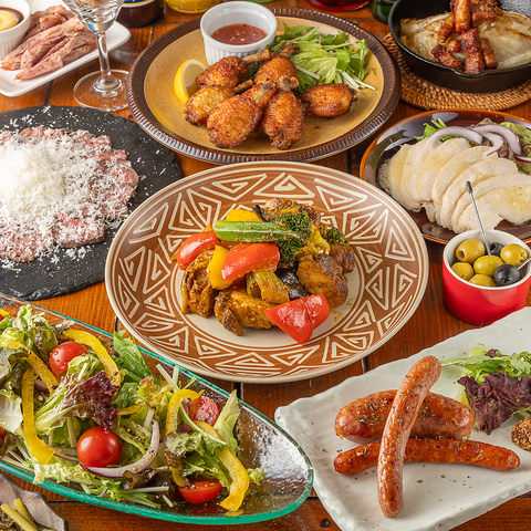 ゆっくり3時間飲み放題付き♪前菜、サラダ、フィッシュ&チップス、名物ジャークチキン、ハラミステーキなど、メインのお肉も2種類が味わえる豪華なコース!〆のお料理は本ズワイガニのクリーミーレッドカレーor禁断の明太子クリーム生パスタからお選びいただけます♪