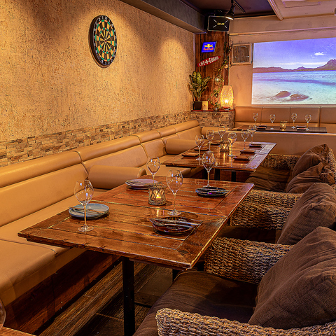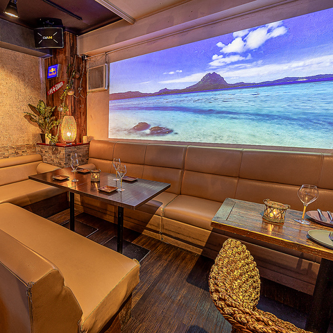 【南国風の店内】扉を開ければ、ウッドチャイムの音色とココナッツの香りが包みます☆大型プロジェクター完備でスポーツ観戦にもぴったり!グループ利用にぴったりのソファー席やお一人様も歓迎のカウンター席など、シーンに合わせてご利用ください♪