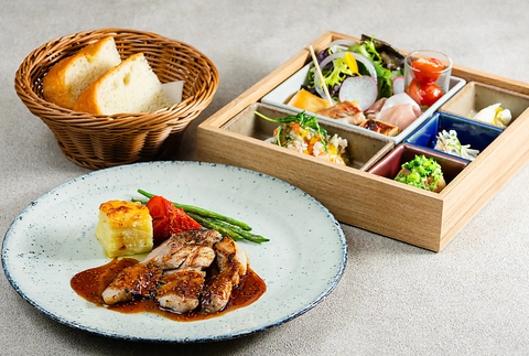 大阪を代表するスターシェフ・鈴木氏が監修した、彩り豊かな「箱前菜」を主軸にした特別なコースです。一品ずつ趣向を凝らした独創的な料理の数々が、箱の中に季節の恵みを凝縮。洗練されたモダンな空間で、五感を刺激する至福のランチタイムを心ゆくまでお過ごしください。