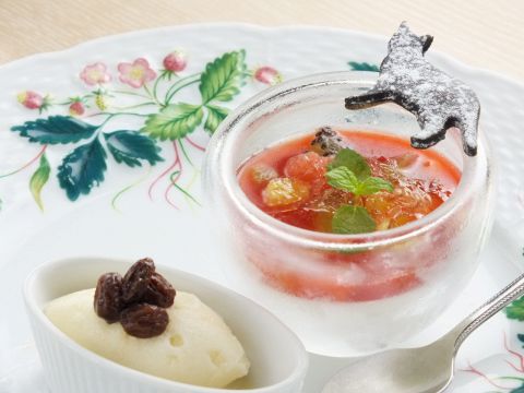 ココナッツプリンにいちごのソース・果物・白ワインのジュレを添えて。爽やかないちごのソースとココナッツプリンの濃厚でやさしい味わい、口にふくむととろけ出す白ワインの極上ジュレがマッチ!見た目もかわいい♪手作りのラムレーズンアイスの風味豊かな香りと深みのある味わいが人気のデザート。大人の女性に人気です。
