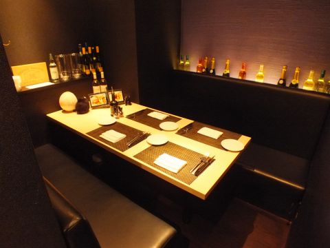最大4名様までご利用可能なソファー個室。黒を基調とした空間―。シックさを引き立たせるダウンライト―。プライベート感たっぷりの空間―。周りの目を気にすることなく、大切な人との特別な記念日や女子会、接待など様々なシーンでご利用ください。