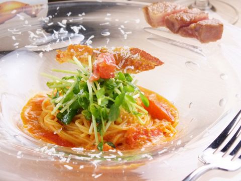 鶏ガラベースのトマトクリームパスタ。細麺のカッペリーニとオイル漬けした豚のコンフィをお楽しみ下さい♪