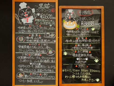 オブジェの様に飾られた黒板。実は細部までおしゃれさにこだわる黒猫のメニュー表。イラスト付きで選ぶのも楽しい!最大16名様までご利用頂けます。貸切にも対応致しますのでお気軽にご相談下さい。