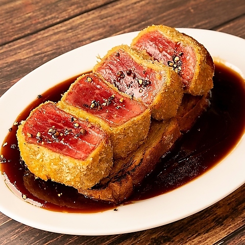 サクッと衣に包まれた、やわらかなビーフの旨み。特製デミグラスソースが染みたライ麦ブレッドとどうぞ!