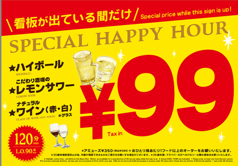 | 飲み放題 | あり :※20歳未満の方・ドライバーの方へのアルコールの提供は固くお断り致します |