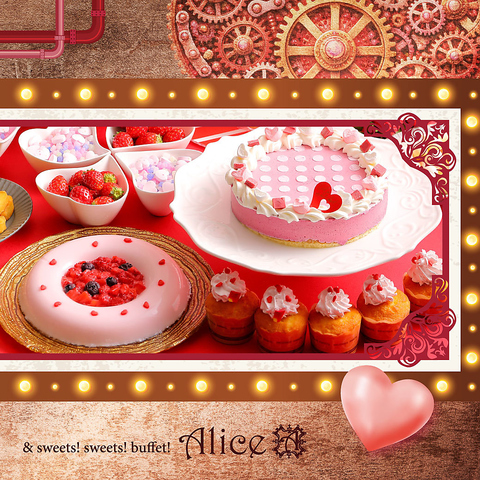 アリスの世界をモチーフに子供から大人まで楽しめるスイーツビュッフェ.。