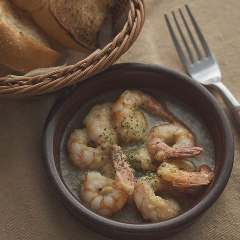 プリップリの海老にディプント特製のソースを絡めた、熱々アヒージョをお替わり自由のパンとご一緒に♪
