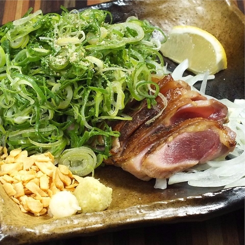 ハーフサイズ 858円(税込) 【売れ筋】炭火で焼いて氷水で締め、たっぷりの刻みねぎとポン酢、生姜&ガーリックチップでお出しします!知覧どりの旨味を引き立てる風味の一体感をお楽しみください。