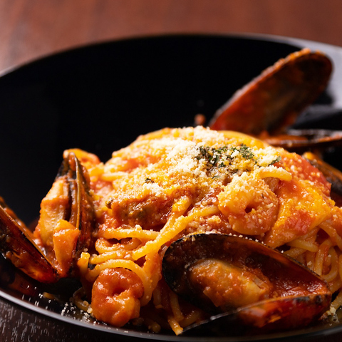全品大盛り無料!2倍盛りはもちろん3倍盛りも登場!お腹いっぱいになる事間違いなし!魚介の旨みがギュッとつまったトマトパスタです。あつあつの出来立てをお召し上がりください。