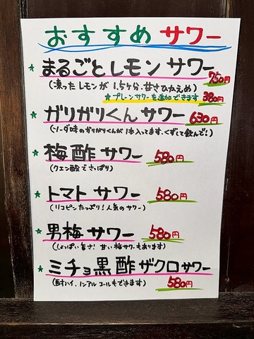 | 酎ハイ | ウーロンハイ/さんぴんハイ/うっちんハイ/梅/もも/青りんご/巨峰/ライム/ライチ/カルピス/カルピスぶどう/シークワーサー/濃いめのレモン/濃いめのグレフル/男梅 |