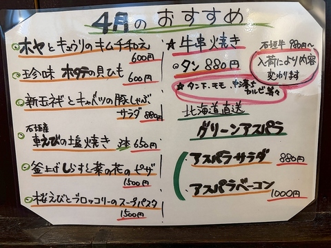 ホヤとキュウリのキムチ和え:600円/珍味ホタテの貝ひも:600円/新玉ネギとキャベツの豚しゃぶサラダ:880円/石垣産車えびの塩焼き3本:650円/釜上げしらすと菜の花のピザ:1500円/桜えびとブロッコリーのスープパスタ:1500円/牛串焼きタン:880円/石垣牛:980円~/アスパラサラダ:880円/アスパラベーコン:1000円
