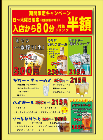月~木曜日限定!ALLタイム入店から80分の間対象ドリンクが半額でご注文頂けます。