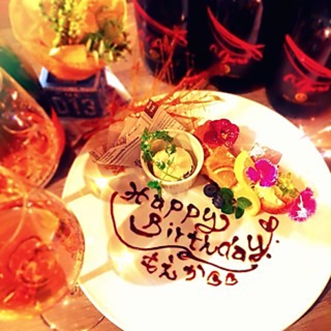 誕生日・記念日にはプレートを無料サービス!!メッセージも承ります。サプライズのお手伝いいたします!記念写真、バースディソングなど、できる限りお客様の希望を少しでも叶える演出をご用意致します♪洗練されたお洒落な空間ですので、大切な日や女子会にも◎お気軽にご相談ください!スタッフ全員でお祝いいたします!