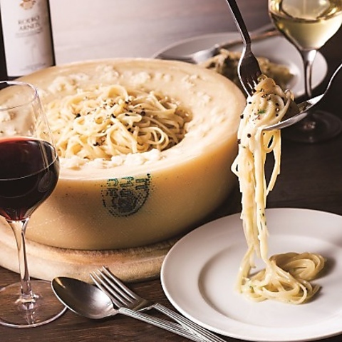 イタリア直送の大きなチーズの器を使い、パスタやリゾットでとろ~り溶かした濃厚料理です!お客様の目の前で仕上げますので、チーズの香りとスタッフの手つきにワクワしながらお待ちください♪写真や動画もご自由にお撮りくださいませ♪