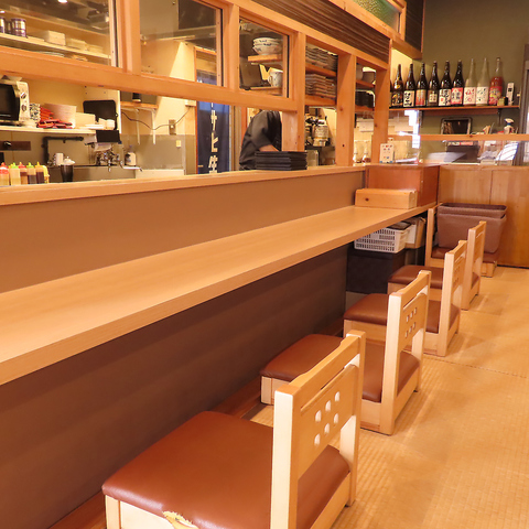 目の前で調理の様子をお愉しみいただけるカウンター席は、掘りごたつになっておりますので足を伸ばしてお寛ぎいただけます。落ち着いた雰囲気なのでお一人様やカップルでのご利用にもオススメ。