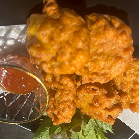イベリコ豚のミンチを使い、特製の衣で揚げました。やめられないとまらない味付けです。自家製のBBQソースで召し上がれ!