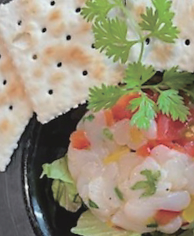 タルタルとは元は色々な食材を混ぜ合わせた物という意味で、マヨネーズは使っていません♪さっぱりしたレモン風味の帆立をクラッカーと一緒にどうぞ!