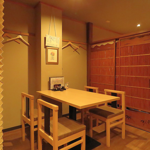 暖簾で仕切られた4名席は隣のお客様の声も気にならず、ゆったりとお寛ぎ頂けます。 総席数37席を完備!ご宴会最大30名様までOK!お席詳細・人数・ご予算など、お気軽にお問い合わせください!※写真は一例です