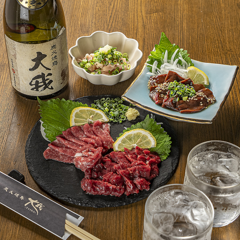 熊本で創業40年の馬肉専門卸から届く高鮮度な馬刺は、当店自慢の逸品。「新鮮馬レバ刺」は独特の食感と甘み、「馬赤身刺」は淡白ですっきりとした旨み。いちばんのおすすめは「極上霜降り馬刺」で、一枚に広がる網目の霜降りが、口内でスッととろけて甘みを広げます。日本酒や焼酎、ワインと合わせてどうぞ。