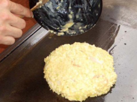 【どんどん亭流・美味しいお好み焼の焼き方3】生地は2cmの厚さで落としましょう。直径は約18cm。焼き時間:落としてから約7分。(この厚みがホクホク感と旨みをかもしだします。ぶた肉がある時は上にのせます。)