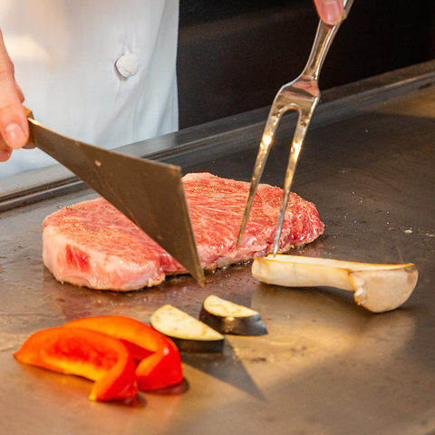目の前の鉄板で焼き、パフォーマンスしながらシェフが教えてくれる《鉄板焼き神戸牛のライブハウス》。