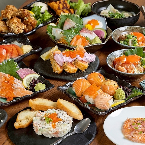 カルパッチョやユッケ、刺身などの定番から、炙りチーズやレアカツ、手毬寿司など創作メニューまで、全13種のサーモングルメが食べ放題。濃厚な旨みと脂の甘みを、さまざまなアレンジで心ゆくまでお楽しみください。締めには鮭茶漬けやサーモン丼もご用意。サーモン好きにはたまらない、大満足の2時間です!