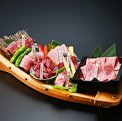 A5ランク三河黒毛和牛を一頭買いしているお店一押し絶品サーロイン他、その日の厳選部位 7種を盛り合わせた豪華な八億円宝船