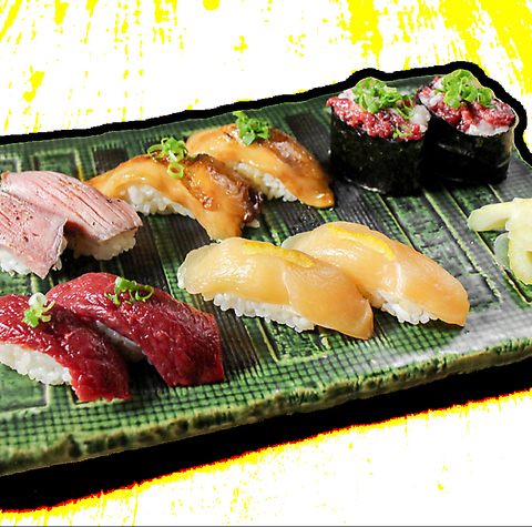 馬肉を中心に、牛、豚、鶏、鴨、ホルモンe.t.c...をネタに単なる創作寿司ではございません!!こだわり抜いた素材と技術を是非その目で!舌で!肉寿司体験してくださいませ!!名物の肉寿司12種(牛3種、馬6種、他3種)の贅沢食べ比べコースもご用意しております。