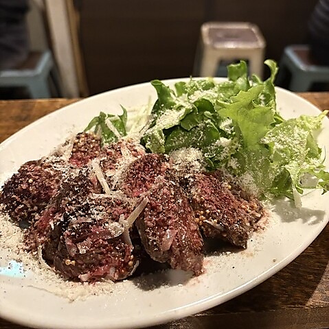 宮崎地鶏をシンプルにしょうが、にんにく、刺し身醤油。またはコク旨塩ソースでカルパッチョ仕立て。どちらかからお選びいただけます◎