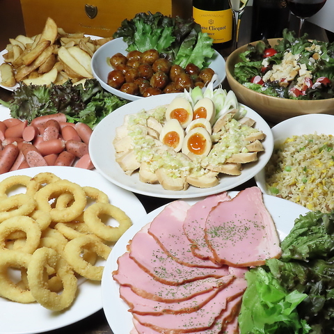 ・新鮮野菜のシーザーサラダ・ショルダーハム・あんかけポルペッティ・フライドポテト・オニオンリング・ソーセージ盛り合わせ・絶品鶏チャーシュー・本日のごはんもの