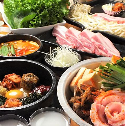人気の「三味豚のサムギョプサル」&「名物!!ピリ辛肉鍋」をどちらも楽しめるコースが新登場!韓国惣菜やチヂミをはじめ、メインには鹿児島県産・三味豚サムギョプサル&名物!!ピリ辛肉鍋お楽しみいただけます。ボリューム満点ですので、女子会や会社宴会、ご家族でのお食事などシーンに合わせてご利用ください。