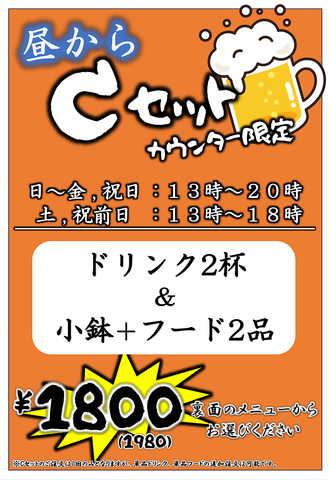 日~金,祝日の13時~20時/土,祝前日の13時~18時時間限定ではございますが通常よりもお得に飲み食いできちゃいます!