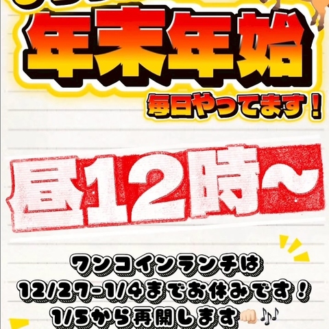 GW、お盆、年末年始ずーっと営業してます♪毎日昼の12時から営業中!お得なコースやクーポンあります!詳細はコース、クーポンページをご覧ください!