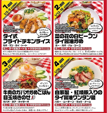 *単品1,080 円(税込)1週目 1/5~1/9【タイ式フライドチキンライス】2週目 1/13 ~16【菜の花の白ビーフンタイ醤油炒め】3週目 1/19~23【牛肉のガパオ炒めごはん目玉焼きのせ】4週目 1/26~30【自家製・紅焼豚入りのタイ醤油ワンタン麺】