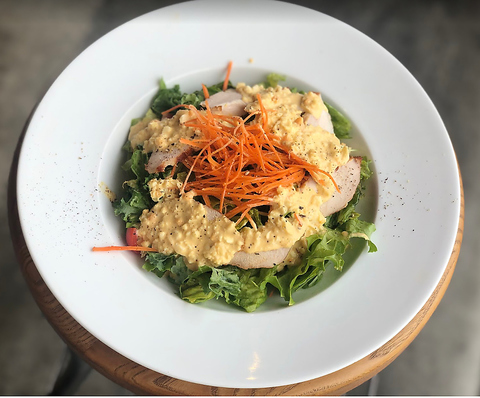特製スパイスで味付けしたオリジナルソーセージ。脂味の美味しい三河もち豚100%使用。無農薬野菜のサラダ添え。