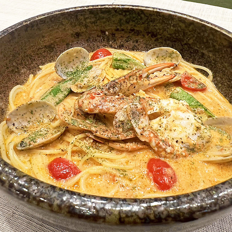 渡り蟹の旨味たっぷり、冬におすすめあったかスープパスタです。デザート・ドリンク付きのりんりんセット価格に+400円でお選びいただけます。