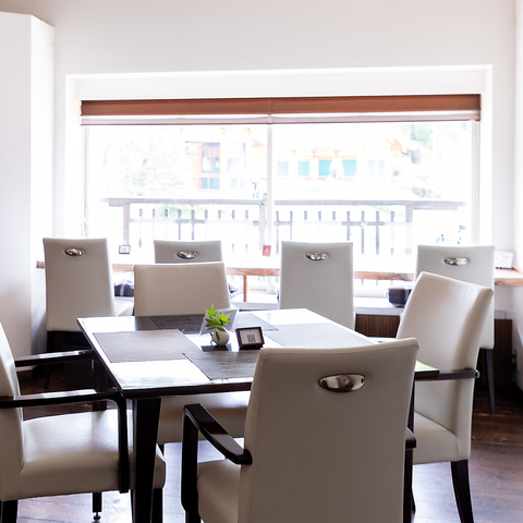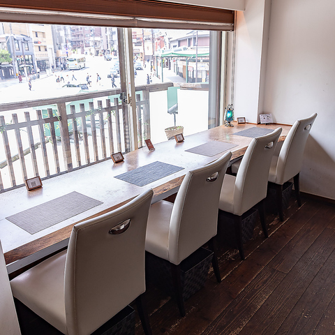 八坂神社を目の前にした店内は梁を露出させた開放的な空間が広がります。京町屋の2階にありながら、圧迫感が全くなく、心地良い明るさが◎白と木目を基調とした清潔感あふれる店内では、BGMとして流れるクラシック音楽が優雅な雰囲気を演出し、食事やカフェタイムをより特別なものにしてくれます。ぜひ、ゆったりとした時間をお過ごしください。
