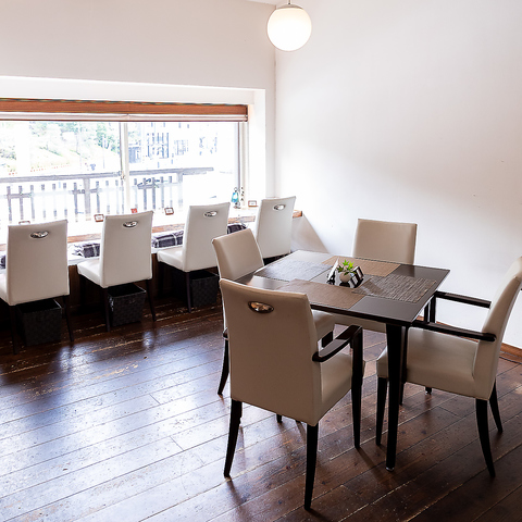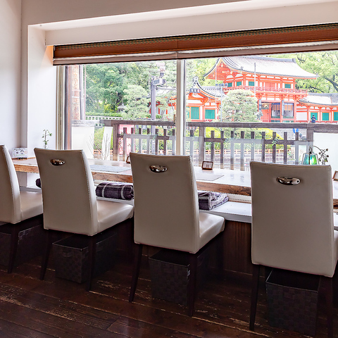 八坂神社を目の前にした店内は梁を露出させた開放的な空間が広がります。京町屋の2階にありながら、圧迫感が全くなく、心地良い明るさが◎白と木目を基調とした清潔感あふれる店内では、BGMとして流れるクラシック音楽が優雅な雰囲気を演出し、食事やカフェタイムをより特別なものにしてくれます。ぜひ、ゆったりとした時間をお過ごしください。