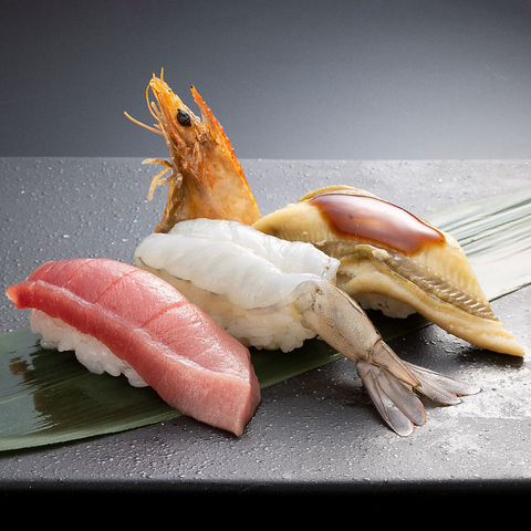 江戸前漬けまぐろ・すずき昆布〆からすみのせ・活〆煮穴子